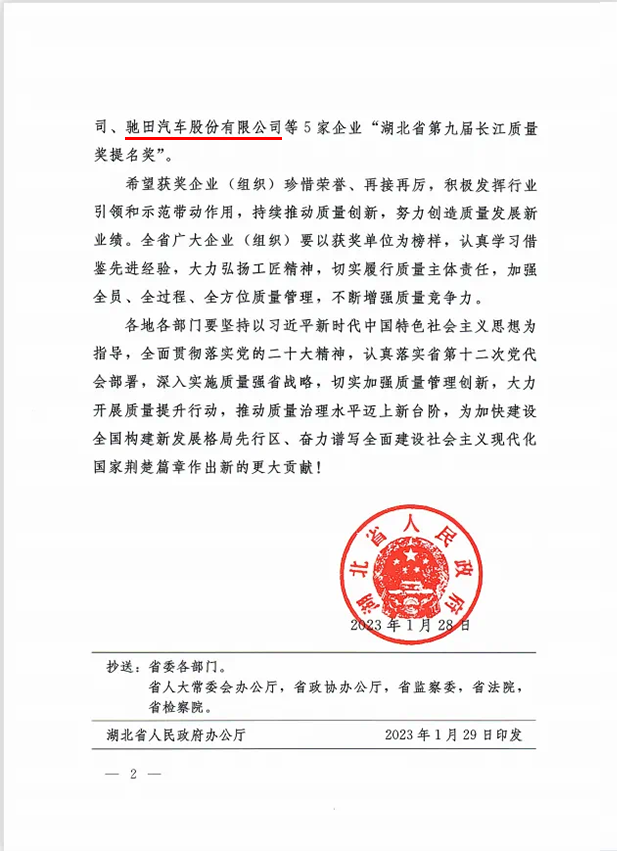 金年会股份一直秉承“建设美丽中国,生产高品质智能化自卸车装备”的企业使命,以“全员参与、全员品质、本质改善、源流管理”为质量文化,持续推进质量管理工作,努力实现“打造中国高轻自卸第一品牌”的企业愿景。此次受到表彰是湖北省人民政府对金年会股份的高度认可,也是金年会股份质量管理工作的重要里程碑。